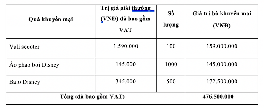 9. Tổng giá trị hàng hóa, dịch vụ dùng để khuyến mại: 476.500.000 VND (Bốn trăm bảy mươi sáu triệu năm trăm nghìn đồng).